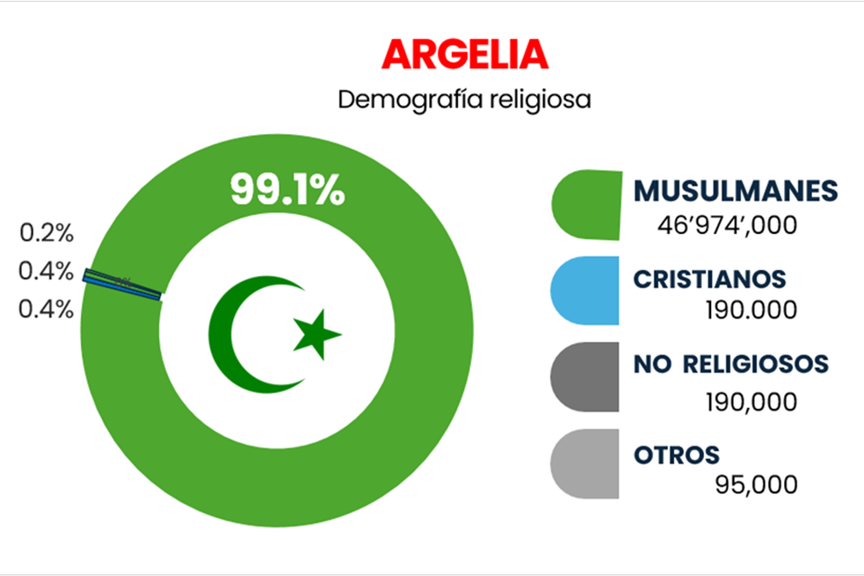 En los últimos tres años, la presión estatal sobre los cristianos protestantes en Argelia se ha intensificado a niveles nunca vistos en décadas. Las autoridades han mantenido cerradas las iglesias que ya lo estaban y han ordenado el cierre de otras. Como resultado, las 47 iglesias pertenecientes a la Iglesia Evangélica Protestante de Argelia han suspendido sus actividades, y otras iglesias independientes también han dejado de reunirse por temor a las medidas del gobierno. Estos cierres han aumentado considerablemente el aislamiento de los cristianos argelinos, que en su mayoría son conversos del islam. Además de los cierres de iglesias, más de 50 cristianos han sido procesados en los últimos años, y algunos han recibido penas de prisión suspendidas y multas. Los conversos siguen enfrentándose a una fuerte oposición por parte de sus familias y comunidades, especialmente en las regiones rurales, conservadoras y árabes, donde la presión y los peligros son particularmente graves.